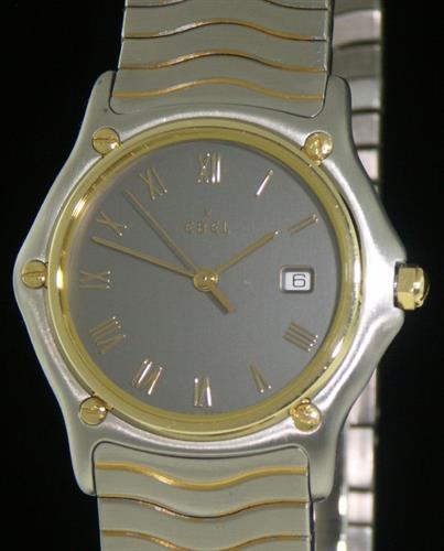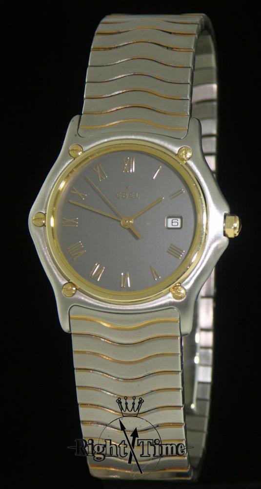 Ebel Sportwave quartz model E1087131. Satin finish stainless steel case and bracelet. Solid 18kt gold bezel. Gray dial with polished gold tone Roman numerals.