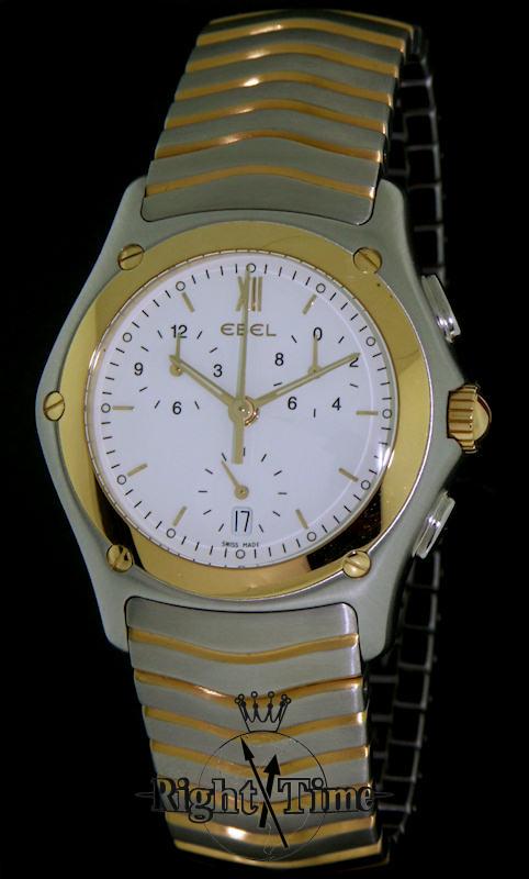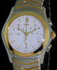 Gentleman`s dress-sport "Classic Wave" Swiss made quartz chronograph by Ebel, with solid 18kt yellow gold bezel, stainless steel chunky links bracelet with 18kt gold accents, domed sapphire crystal