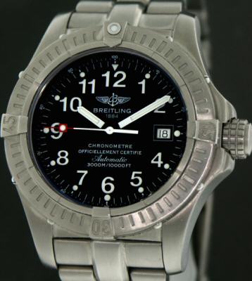 Breitling all Titanium 44mm Super Avenger COSC automatic 3000m divers model with black dial and white luminous hands and markers.