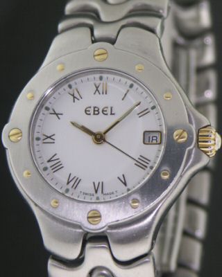 Ebel Sportwave quartz wrist watch with 18kt yellow gold screws on the bezel with all satin finish stainless steel case and bezel.