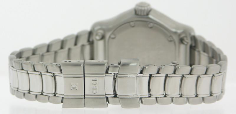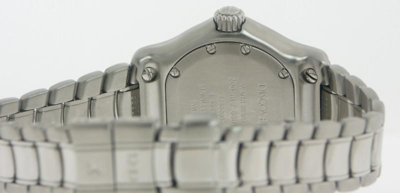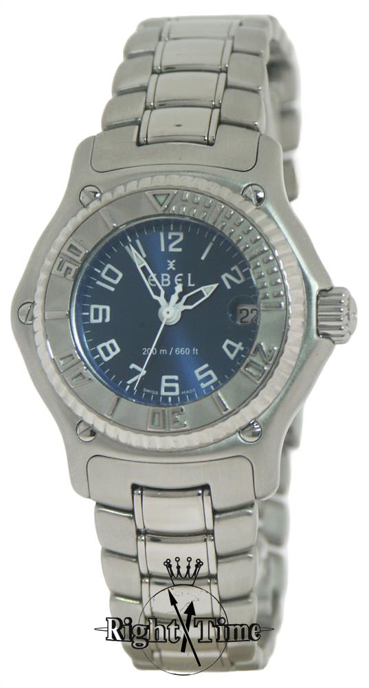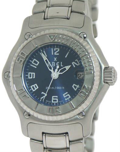 Ebel Discovery model 1213573. Swiss quartz analog movement. Solid 316L stainless steel case and bracelet. Uni-directional steel bezel with raised 60 minute scale. Blue dial with Arabic numerals. Sapphire crystal. Water resistant to 200 meters.