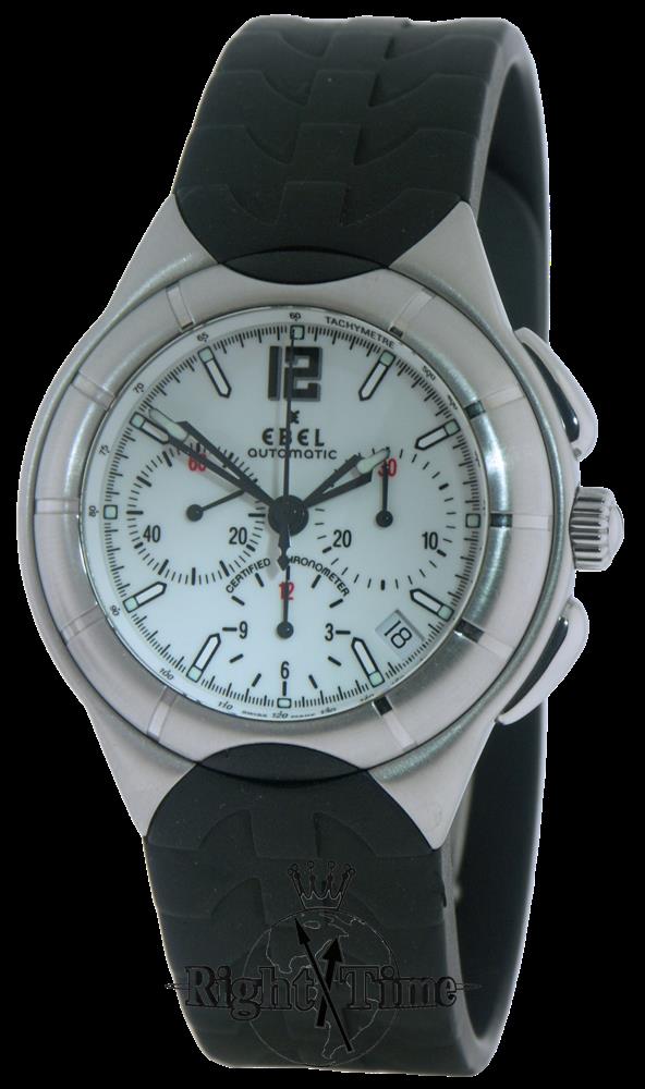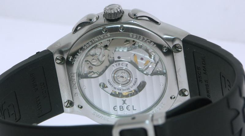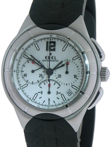 Ebel E-Type automatic chronograph inside slick design satin finished stainless steel case with sporty style rubber strap, powered by Ebel inhouse calibre 137, built by Lemania
