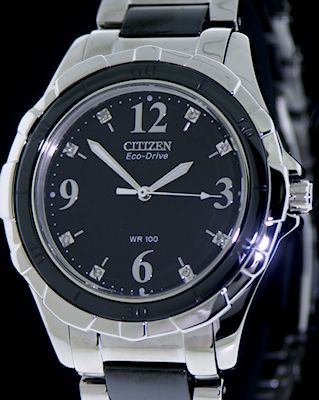 Citizen ladies dress model with quartz movement that never needs a battery - it runs on light! Polished Steel and black ceramic bezel and bracelet. Black dial with diamond markers. 100 meters water resistant.