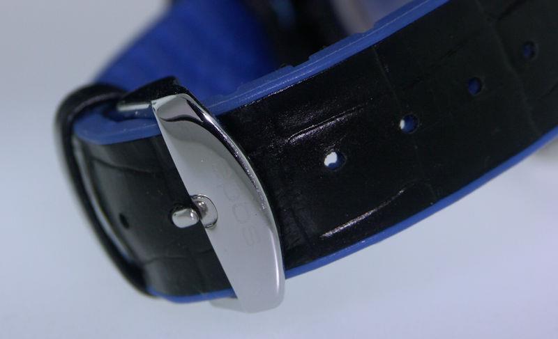 Date calendar, window display. 12 hr, 30 min, 60 sec registers chronograph.