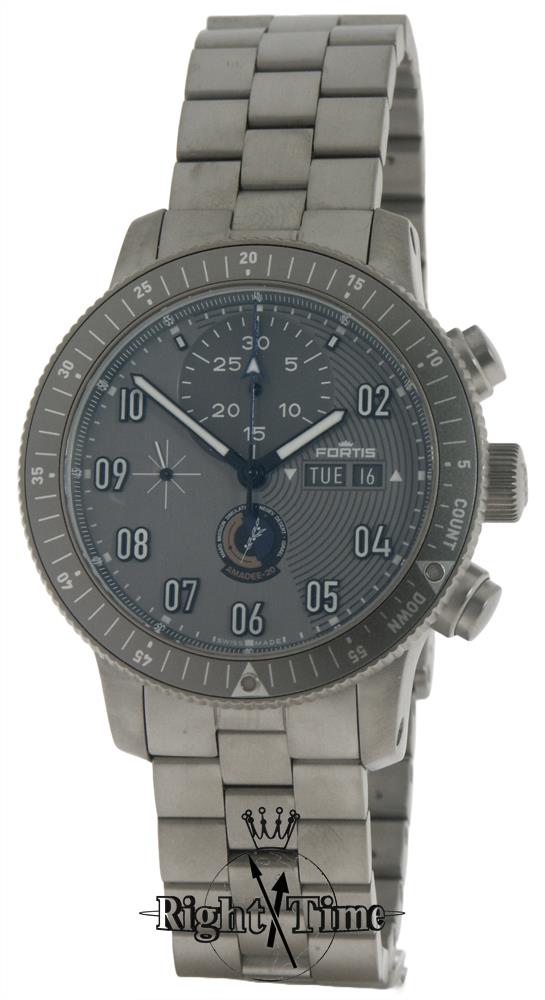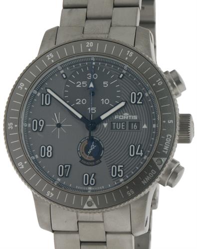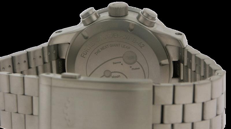 Fortis B42 Cosmonauts official timepiece of the AMADEE-20 Mars simulation mission. Model number w.204.0018,sandblasted all titanium case and bracelet, powered by a Swiss Valjoux 7750 Automatic chronograph 30min/60sec movement. Oversized push in crown still allows for 200 meters of water resistant.