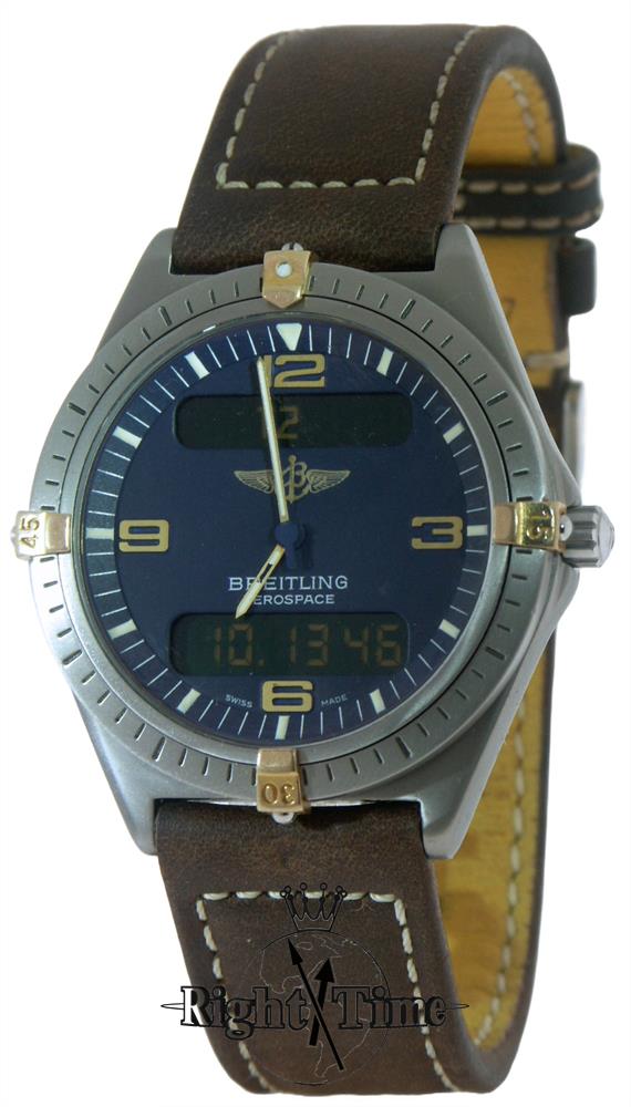 Breitling Aerospace Navitimer style F56059l analog/digital wrist watch powered by Swiss ETA quartz movement Cal. 988. All titanium case on brown crocodile strap. Watch functions: analog and digital display, alarm, chronograph, second time zone, timer.