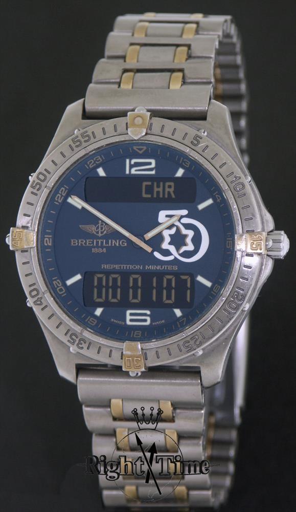 Special commemorative limited edition of only 500, celebrating in 1998 Israel`s 50th anniversary, Breitling Aerospace style F65062 analog/digital wrist watch powered by Swiss ETA quartz movement Cal.65. All titanium case, 18kt gold and titanium bracelet. Watch functions: analog and digital display, alarm, chronograph, second time zone, timer, minute repeater.