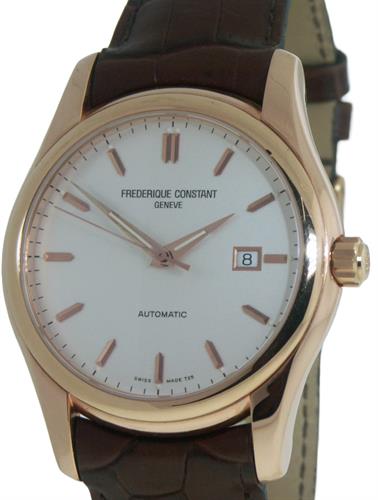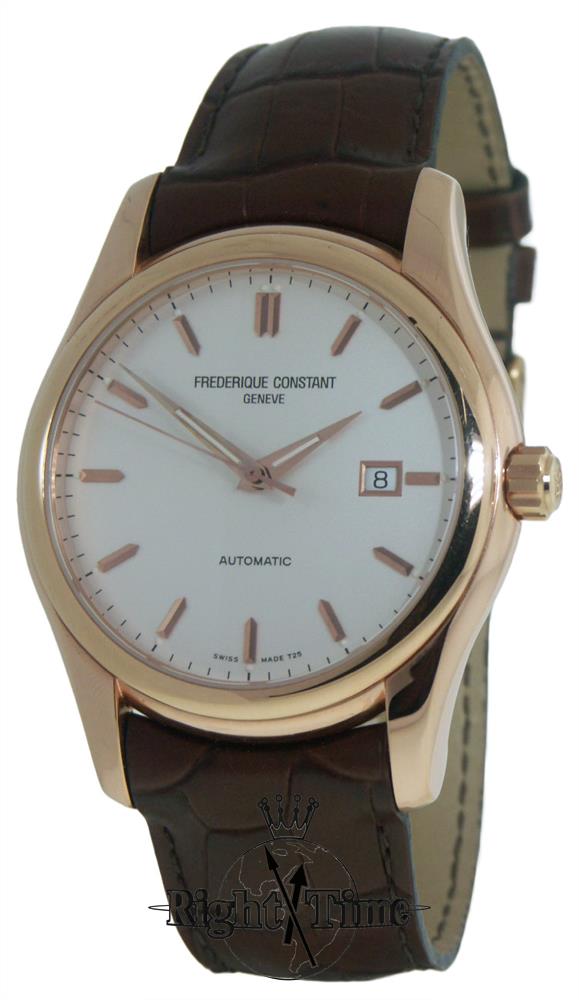 Frederique Constant Classic Collection. The only dress watch model with tritium filled tubes in hands for night visibility. Model FC-303V6B4. Swiss Sellita Sw200 automatic movement. Stainless steel rose gold PVD case. White color dial. Brown alligator style leather band.