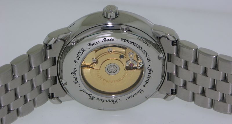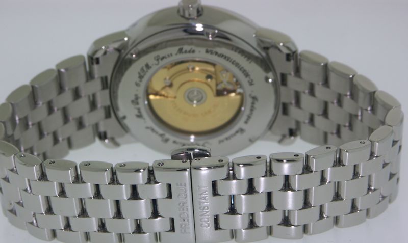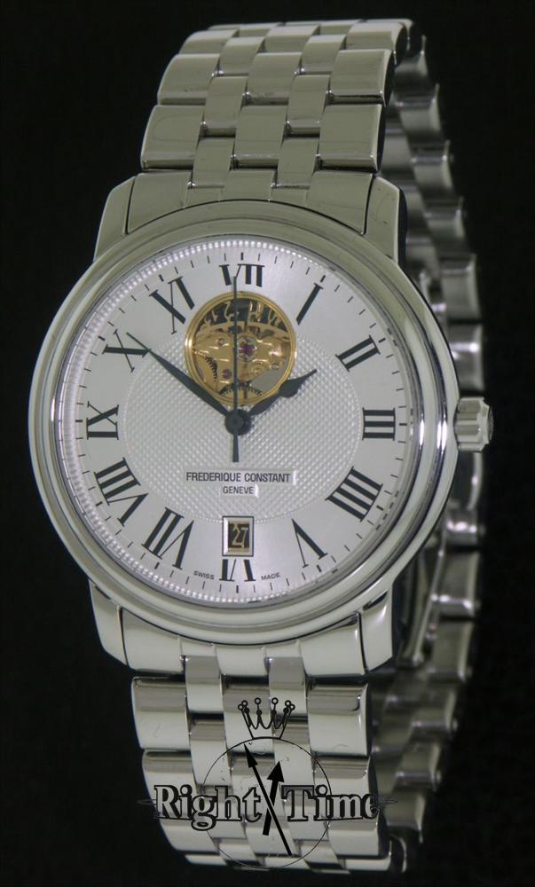 Silver color. Roman printed numerals. Frederique Constant signature Heart Beat aperture at 12 o’clock.