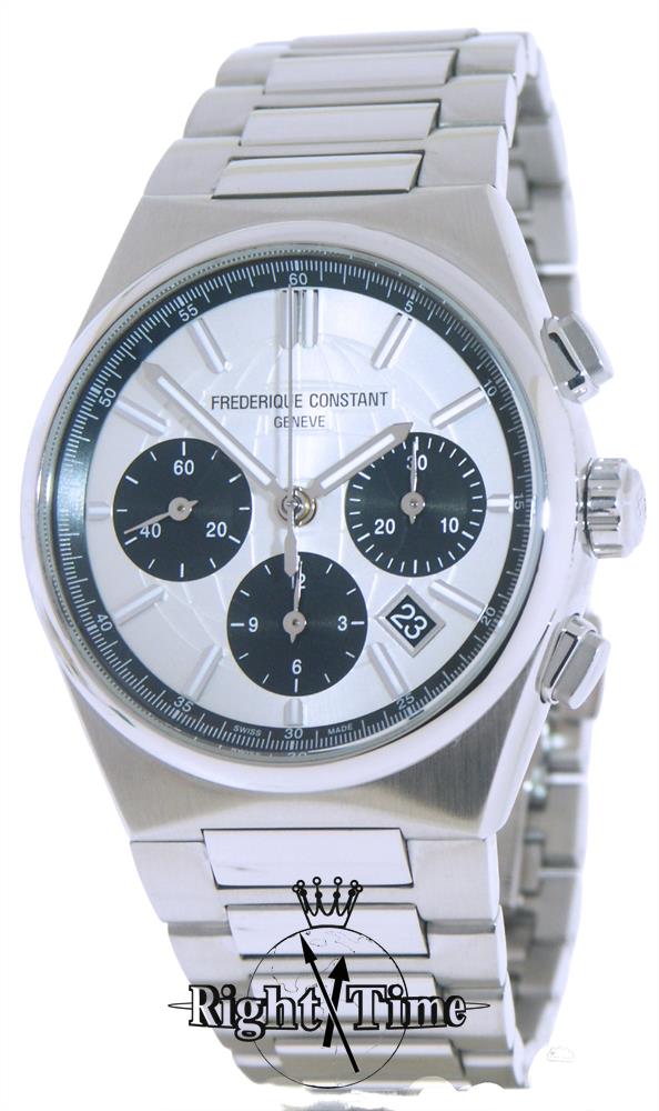 Frederique Constant Highlife Collection. Model FC-391SB4NH6B. Swiss automatic chronograph Manufacture la Joux-Perret LJP L110 movement. Stainless steel round case. White dial with globe decoration, black sub-dials, and outer ring. Stainless steel and rubber bands