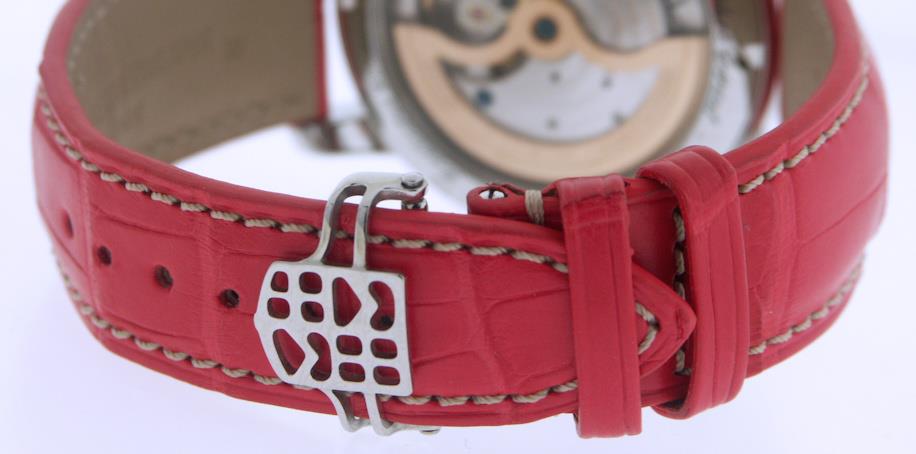 Red color. Genuine Alligator leather. Factory Logo embossed. As an US Exclusive Limited Edition model it comes with 3 bands: Red(Alligator), White(Alligator) and Blue(Rubber).