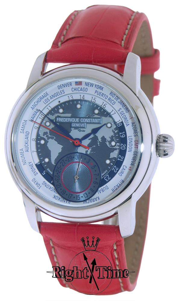 Frederique Constant Highlife Manufacture Collection. Celebrating America`s 250th birthday this US Exclusive Limited Edition of symbolic 76 pieces, world time model 718USWM4H6. Swiss automatic in-house FC-718 movement with perlage and circular Cotes de Geneve decoration. Blue and grey dial with date pointer hand and globe decoration. Polished stainless steel case with 3 straps representing US flag -red, white and blue