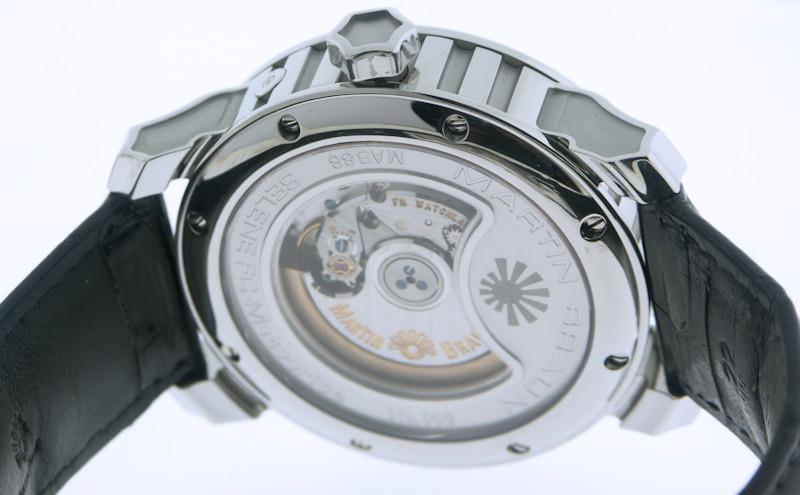 25 jewels. Swiss made Mechanical Automatic (Powered by wrist motion). Martin Braun Cal.88 based on Sprod A.10 with unique 100 year moon phase indicator platform.