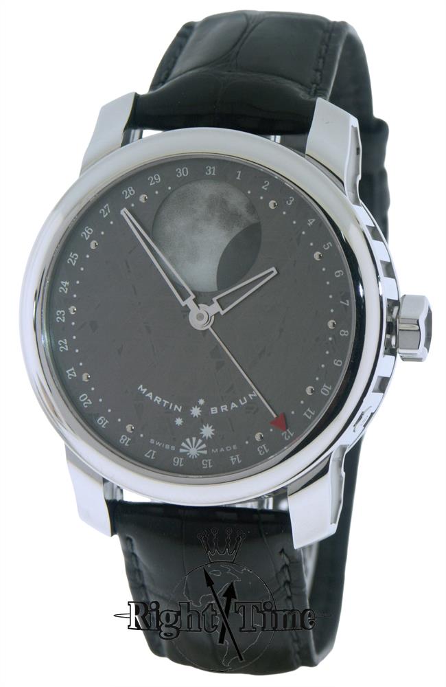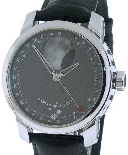 Swiss made Martin Braun "Selene Meteorite" dial automatic model with large realistic photo true moon phase indicator, accurate for the next 100 years