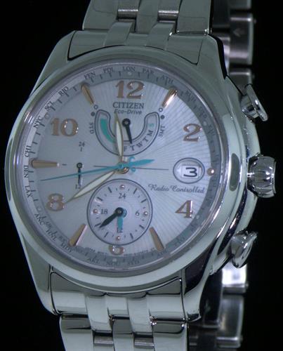 Citizen Eco-Drive radio controlled with atomic clock synchronization model FC0000-59D. Quick-set World time function for 26 time zones. Polished stainless steel case and bracelet. Mother-of-Pearl dial. Water resistant to 100 meters. Sapphire crystal.