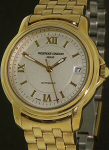 Frederique Constant automatic watch. Gold plated steel case and band. Roman numerals on white dial with date.