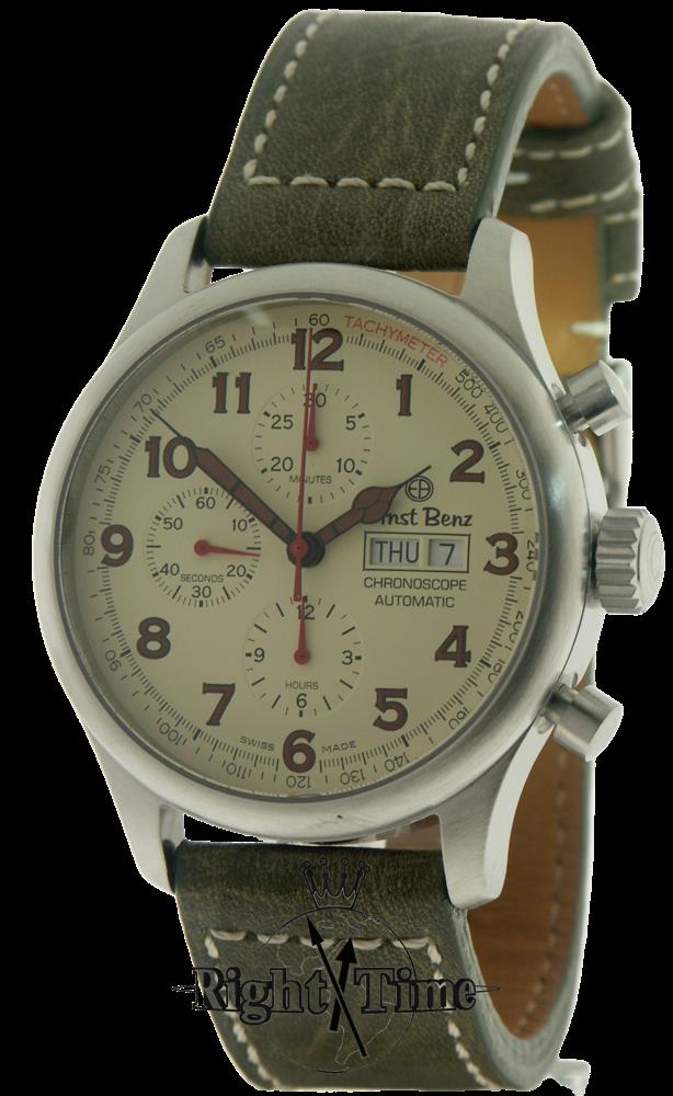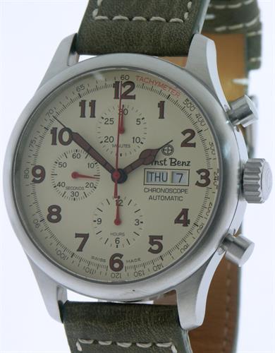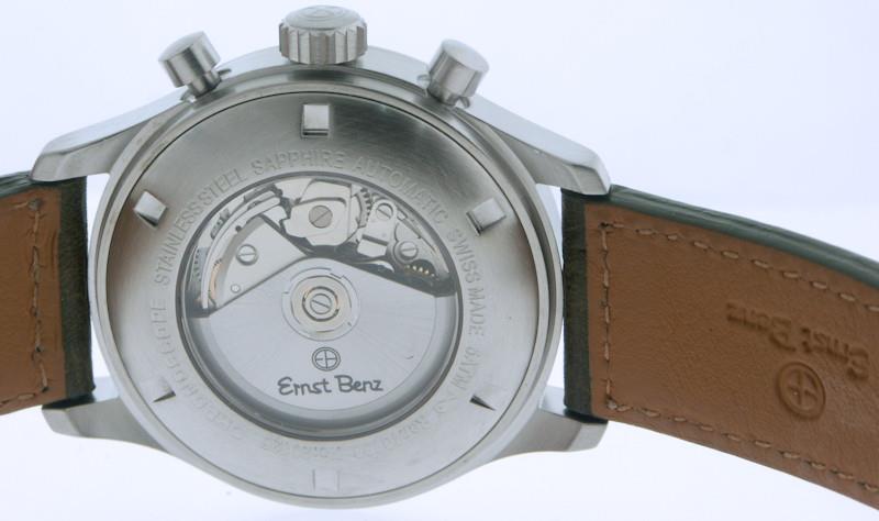 Ernst Benz Chronoracer Scope model GC10100/CR2 powered by Swiss ETA Valjoux 7750 automatic chronograph movement. Brushed stainless steel case. Blue dial with white sub-dials, luminous orange Arabic numerals and day/date calendar. Black handmade Aviator alligator leather strap with orange and blue color stitching. Limited edition of 50 pieces.
