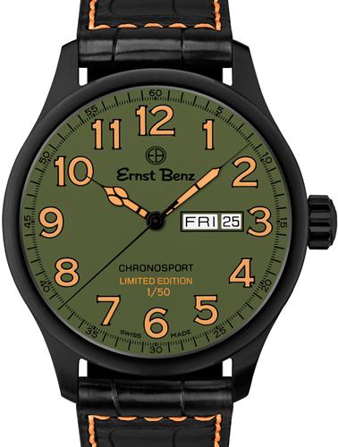 Ernst Benz Chronocombat Sport model GC40200/CC1-DLC. Limited Edition of 50 pieces. Powered by Swiss ETA 2836-2 automatic movement. Black DLC brushed stainless steel case. Green dial with orange Arabic indexes and day/date calendar. Black Aviator Alligator leather band with orange color stitching.