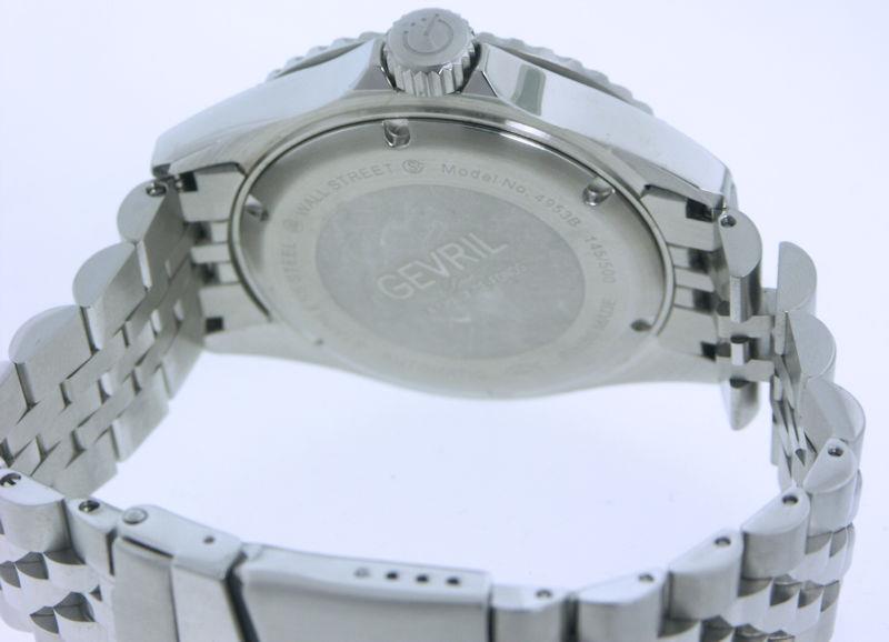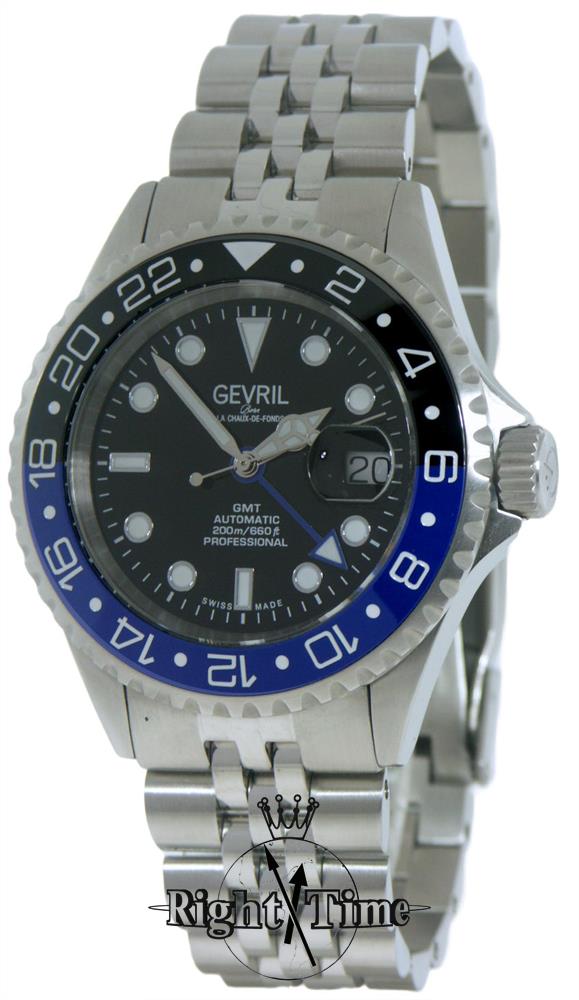 Gevril `Wall Street GMT` automatic 200m diver powered by Sellita SW300 black dial, black and blue ceramic bezel, 43mm stainless steel case and jubilee style bracelet