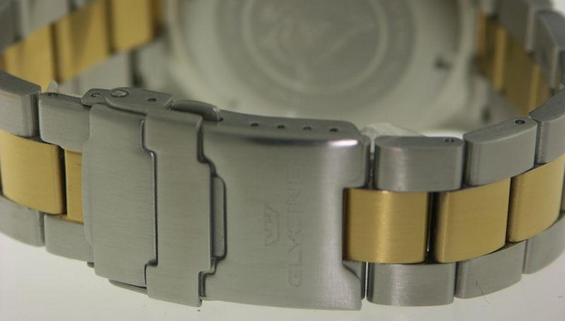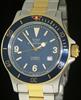 Glycine Combat Sub model GL0262. Combination stainless steel and gold plated case/bracelet. Ratcheted gold plated steel bezel with blue 0-60 minute insert. Blue dial with antique color luminous Arabic numerals and markers. Swiss made automatic movement. Water resistant to 20ATM.