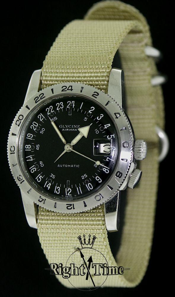 Very unique Glycine "Airman" that was used extensively by pilot during Vietnam conflict. Dial has a small hole drilled below 12 o`clock and when crown at 3 is pulled out a very thin steel wire comes through and stops the second hand at 12, this feature was implemented for a prices synchronization of watches between the members of the squadron or for precision bombing raids.