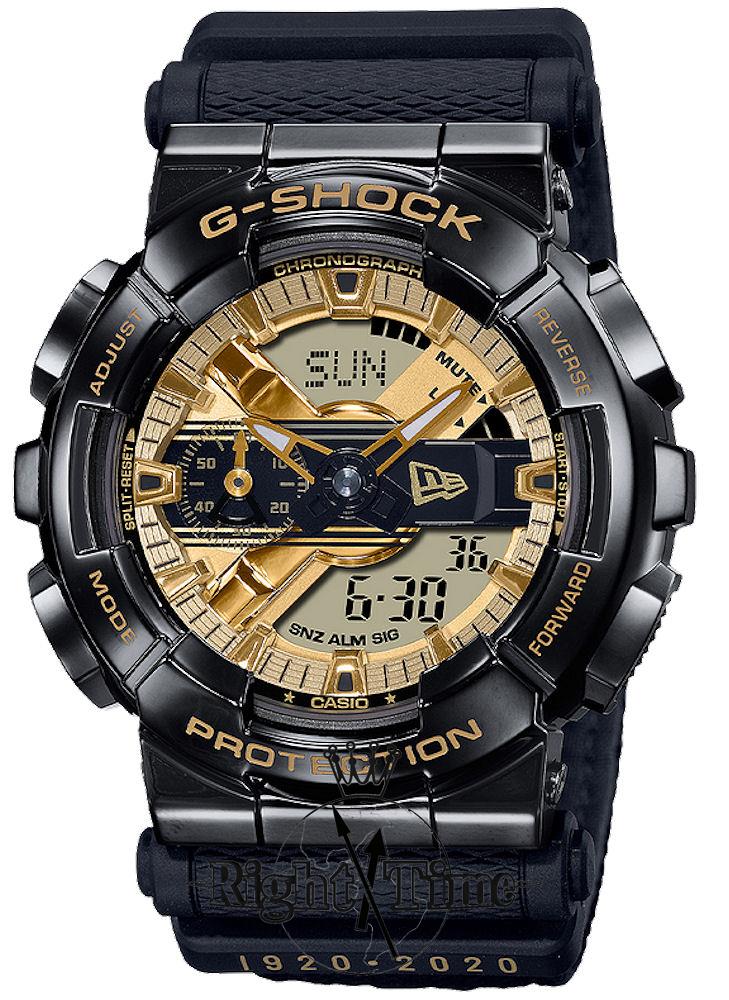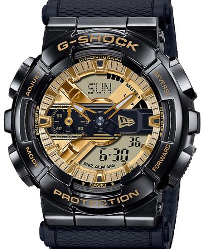 G-Shock GM110 Series model GM110NE-1A. G-SHOCK teams up with New Era to develop the limited edition watch, in celebration of the iconic headwear brand`s 100th anniversary. Black case and band. Black and gold dial with the New Era gold flag at the 3 o`clock position. Engraved golden case back. Special package featuring the inscriptions "100"," 1920-2020".