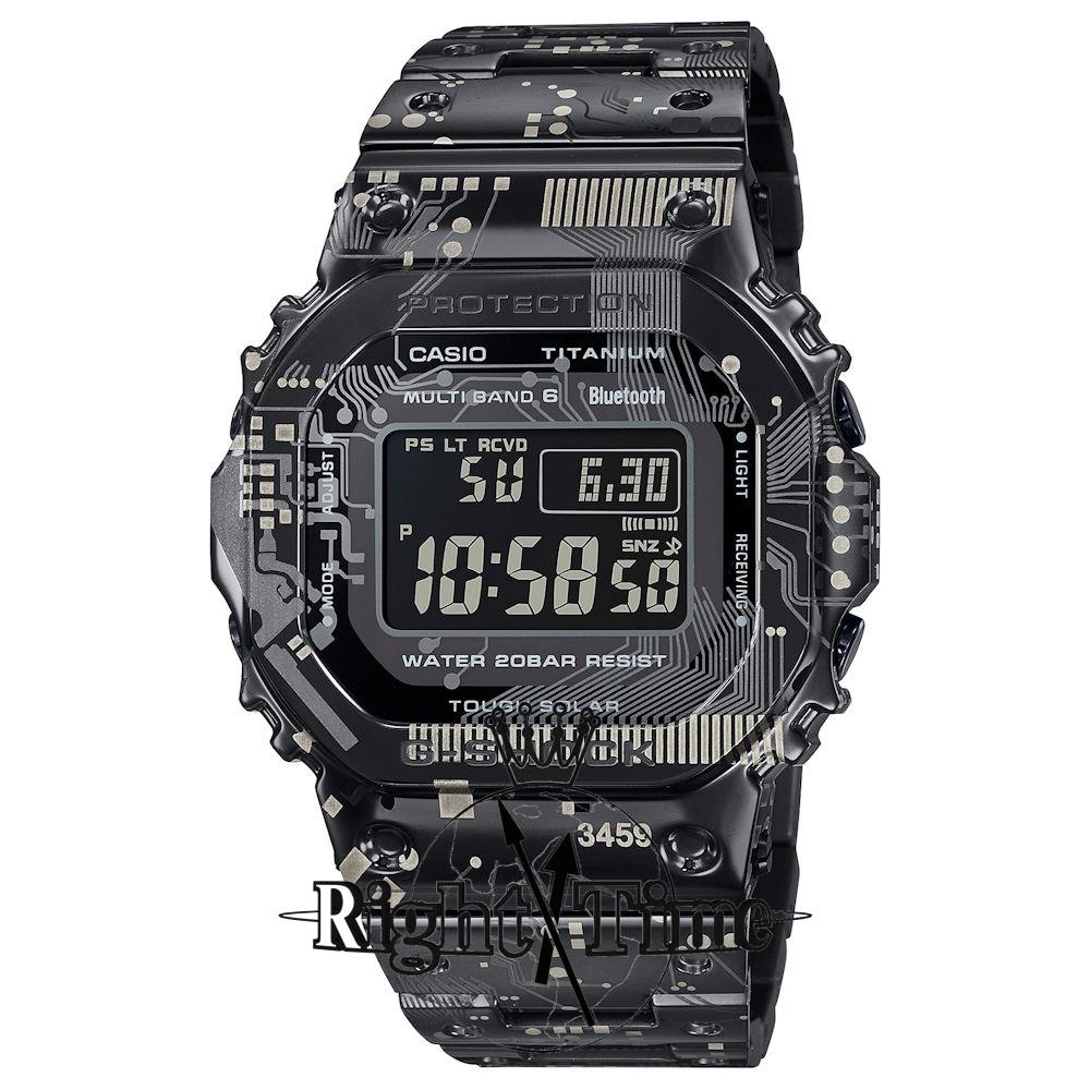 G-Shock Full Metal 5000 Series model GMW-B5000TCC-1. All titanium case and bracelet with one-of-a-kind laser circuit-board camouflage Print, Solar Powered, Bluetooth smartphone link, Multi-band receiver, 200 Meter Water Resistant. Black digital dial