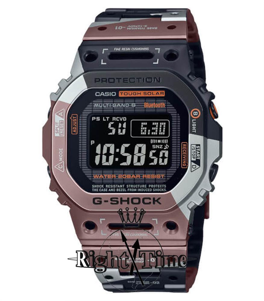G-Shock Full Metal 5000 Series model GMW-B5000TVB-1. Geometric camouflage in black and brown ion plating on an all titanium case and bracelet. Solar powered, MB6 atomic timekeeping, and Bluetooth smartphone link capable. Sapphire crystal. 200 meters water resistant.