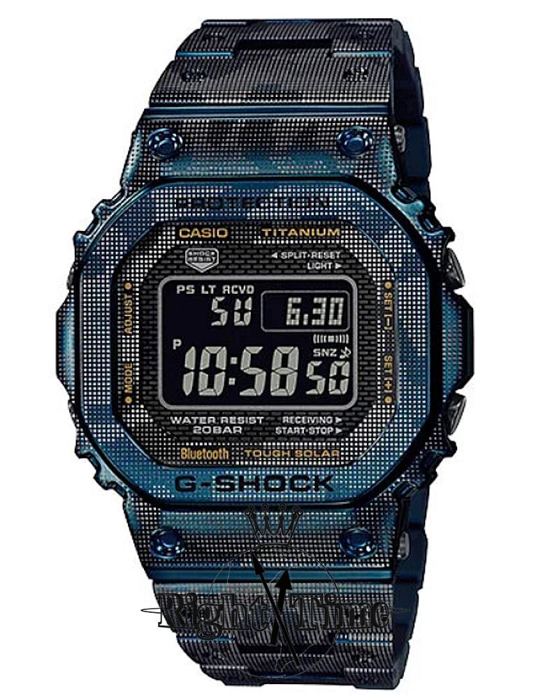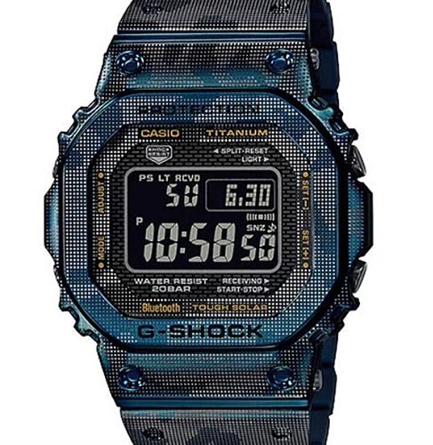 G-Shock model GMW-B5000TCF-2. All titanium blue case and bracelet with one-of-a-kind laser Camouflage Print, Solar Powered, Bluetooth smartphone link, Multi-band receiver, 200 Meter Water Resistant. Black digital dial