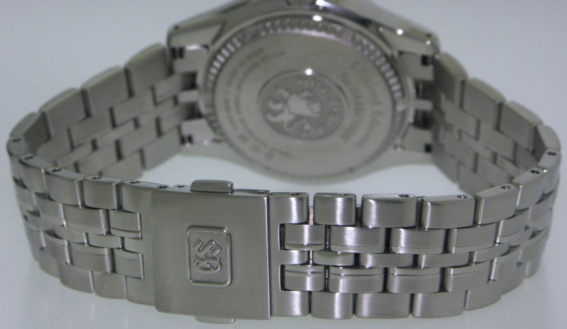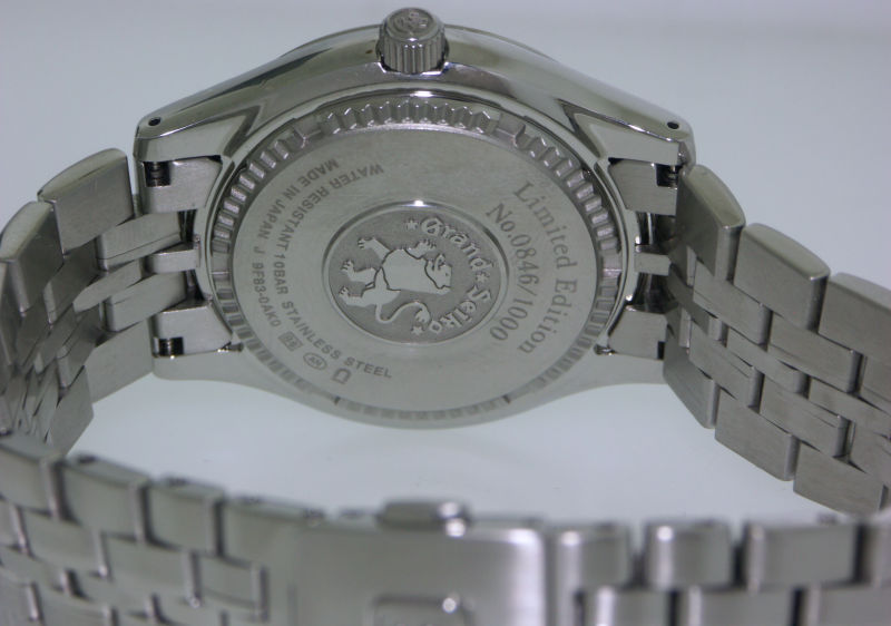 Grand Seiko quartz model SBGT039 part of Seiko 130th anniversary celebration. Limited edition of 1000 pieces. Featuring 37mm steel case with bracelet, anti reflection coated sapphire crystal, screw down crown, high grade 9F83 quartz movement with +/-5 sec. per year accuracy. Dial has textured and repeat pattern of "S" (stand as Seikosha, found on may 50s Seikos) and Grand Seiko logo are printed in dark blue, the traditional Seiko`s color. Solid case back has limited number stamped among with the anniversary scripts. Made for Japanese domestic market.