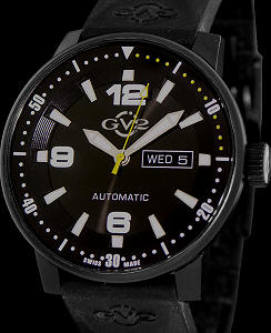 Very unusual, "All dial" look of this Swiss made Gevril GV2 4016 model in all black satin finish stainless steel case and rubber strap, with oversized luminous markers and hands. Limited Edition