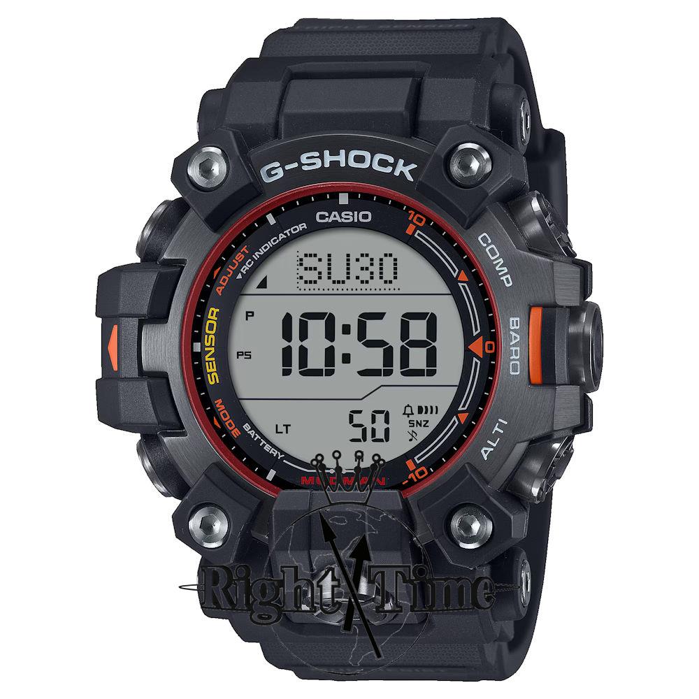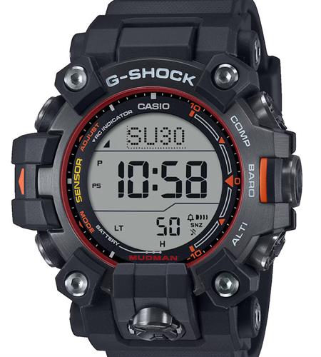 Casio G-Shock Master of G Land Series Mudman. Black color case and band constructed of bio-based resins derived from renewable organic resources. Digital dual-layer LCD dial. Mineral glass crystal. Tough solar movement with Multi-band atomic timekeeping. Functions include compass, altimeter, barometer, thermometer, stopwatch, alarms, timer, and world time.