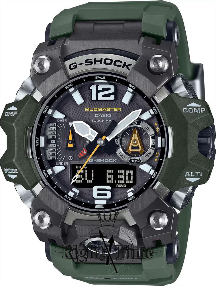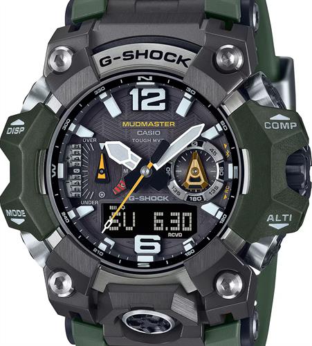 Casio G-Shock Master of G Mudmaster model GWG-B1000-3A. Carbon core guard structure with black DLC/gray IP bezel. Combination analog/digital. Black dial with luminous Arabic numerals and hour markers. Movement features include solar powered, Multi-band radio controlled, Bluetooth connected, and a triple sensor (altimeter, barometer, compass). Functions include world time, stopwatch, timer, and multiple alarms. Sapphire crystal. Water resistant to 200 meters. Green resin strap.
