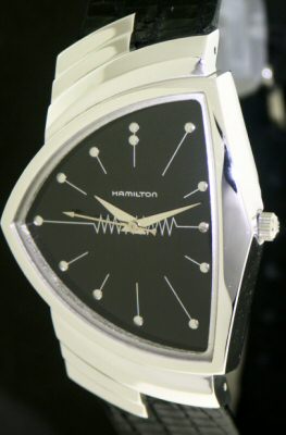 Hamilton Ventura wrist watch model H24411732 from Hamilton American Classic Collection. Swiss Quartz movement. Highly polished uniquely shaped stainless steel case looks very high tech! Black dial with cool wave design.