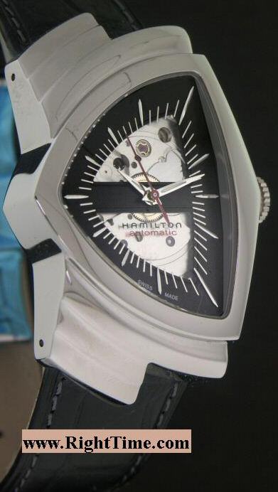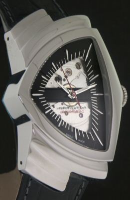 Hamilton Ventura 50th Anniversary. Hamilton Ventura, the world`s first electric watch, launched in 1957. The Ventura made the first of its many Hollywood appearances on the wrist of Elvis Presley in the 1961 production, "Blue Hawaii". This edition has familiar shield shape but is powered by automatic movement. Limited Edition of 1957 pieces.