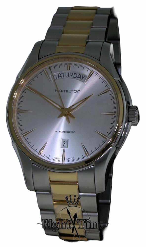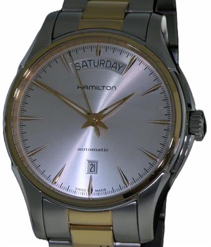 Hamilton Jazzmaster wrist watch model H32595151 from Hamilton American Classic Collection. Powered by Swiss made ETA 2834-2 automatic movement with day-date calendar, 41mm stainless steel case and two tone bracelet, sapphire crystal, silver color dial.