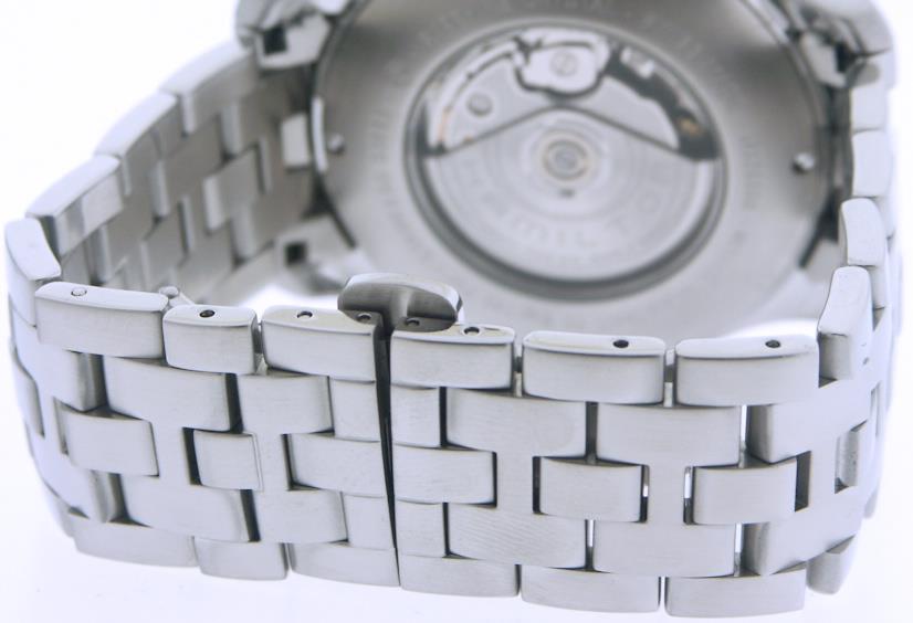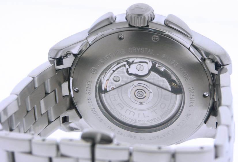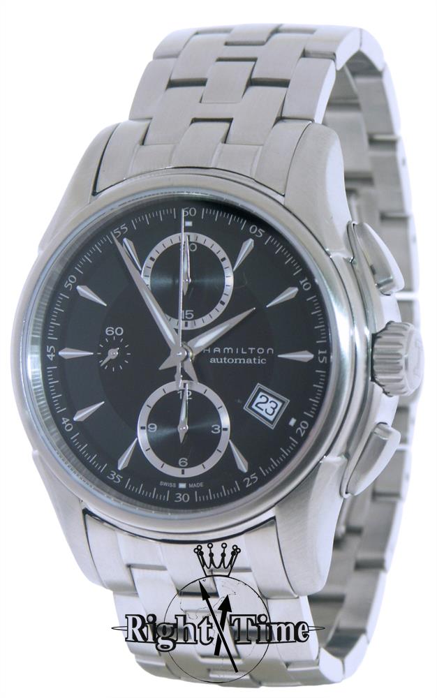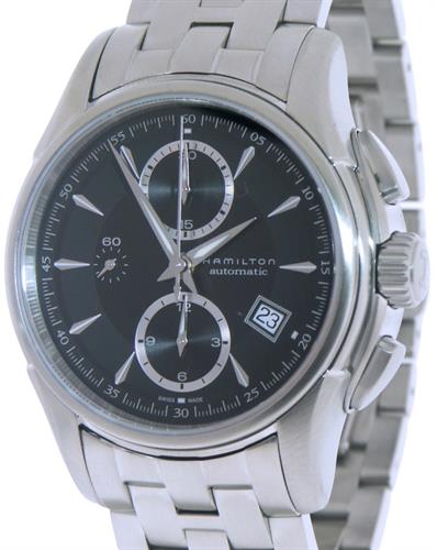 Hamilton Jazzmaster model H32616133. Swiss made ETA/Valjoux 7750 automatic chronograph movement. All satin finish solid stainless steel case and bracelet. Sapphire crystal. Black dial with steel tone hands and markers.
