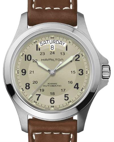 Hamilton Khaki King Automatic model H64455523. Hamilton Caliber H-40 automatic movement with day/date function and 80 hour power reserve. Solid stainless steel case. Beige dial with Arabic numerals. Sapphire crystal. Brown leather strap with white stitching. Water resistant to 50 meters.