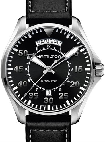Hamilton "Khaki Pilot 42" automatic model, featuring Flieger style marking on black dial with satin finish applied double digit minute scale on the outside and hour scale on the inside, powered by ETA 2834-2 double calendar Swiss Automatic, with over-sized luminous hands.