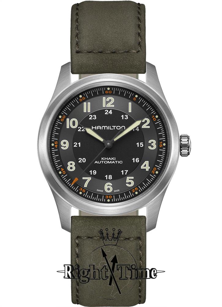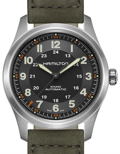 Hamilton Khaki Field model H70205830. Swiss made Hamilton calibre H-10 automatic movement with 80 hour power reserve. Black dial with luminous Arabic numerals and orange accents. Pure titanium case in 38mm. Green color leather strap. Sapphire crystal.