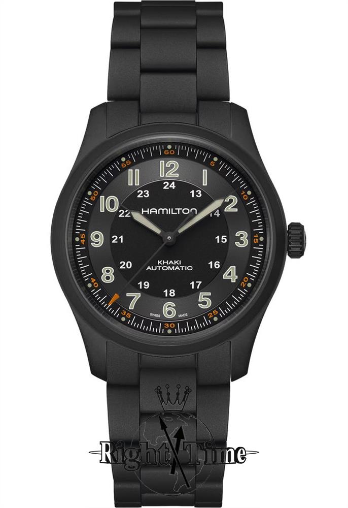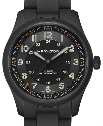 Hamilton Khaki Field Automatic wrist watch model H70215130. Self-winding Hamilton H-10 automatic movement with 80 hour power reserve. Pure titanium case and bracelet with a black PVD coating. Black dial with luminous hands and Arabic numerals. Sapphire crystal.