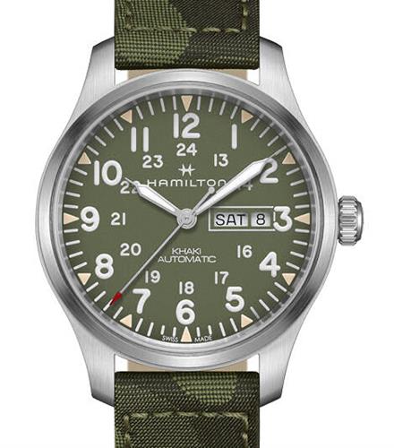 Hamilton Khaki Field Automatic wrist watch model H70535061 from Hamilton Khaki Collection. Self-winding mechanical Swiss ETA movement, day/date calendar, green dial with luminous hands and Arabic numerals, green camouflage style nylon strap.