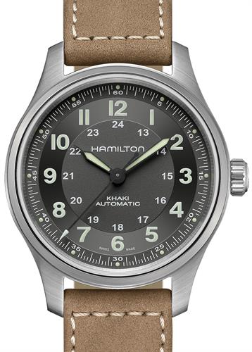 Hamilton Khaki Field model H70545550. Swiss made Hamilton calibre H-10 automatic movement. Dark grey/black dial with luminous Arabic numerals. Solid titanium case. Ultra-soft light brown leather strap. Sapphire scratch resistant crystal.