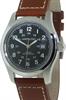 Hamilton Field model H70555533 from the Hamilton Khaki Collection. Swiss made Hamilton H-10 automatic movement with 80 hour power reserve. Solid stainless steel case. Black dial with luminous hands and markers. Sapphire crystal. Brown leather strap with white stitch.