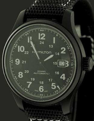 Black Hamilton H70575733 KHAKI FIELD AUTOMATIC 44MM satin titanium case with luminous markers and hands, powered by ETA 2824-2 Swiss made movement