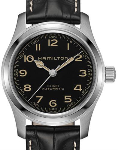 Hamilton Khaki Field model H70605731. Dubbed the "Murph" from the Christopher Nolan thriller Interstellar. Swiss made Hamilton H-10 automatic movement with 80 hour power reserve. Solid 42mm stainless steel case. Black dial with Arabic numerals. Black padded alligator grain strap with white stitch. Sapphire crystal.