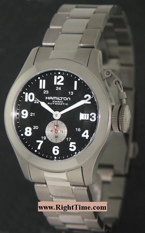 Hamilton Khaki Navy Frogman wrist watch model H77415133 from Hamilton Khaki Collection. 27 jewels self-winding mechanical Swiss ETA 2895 movement, date calendar, small seconds platform, black color dial with luminous hands and Arabic numerals, exhibition case back, titanium case and watch bracelet. 200m Water Resistant.