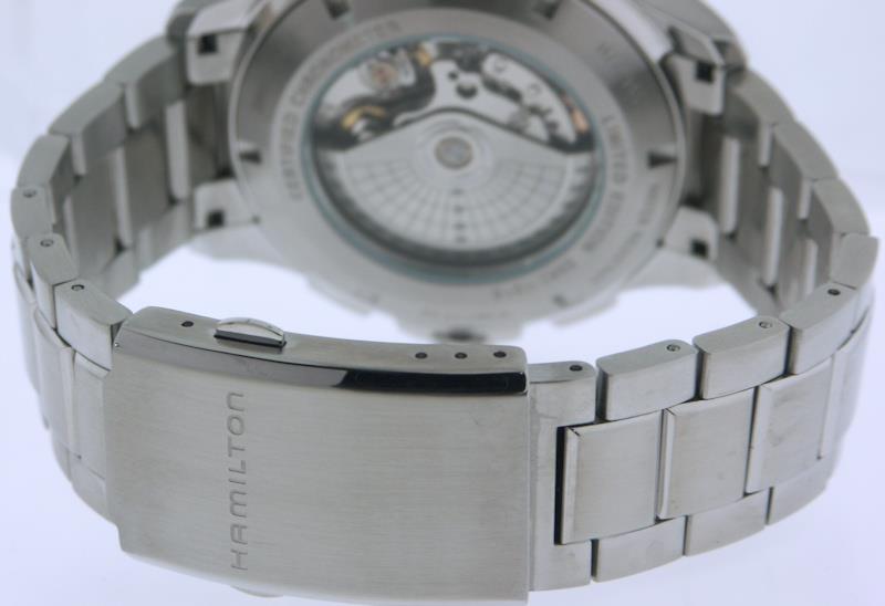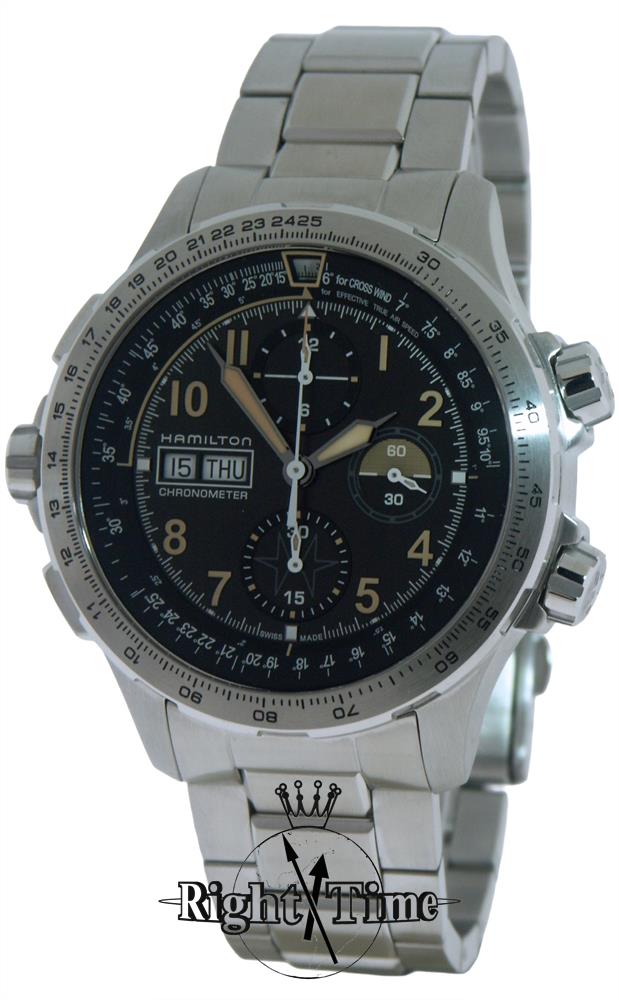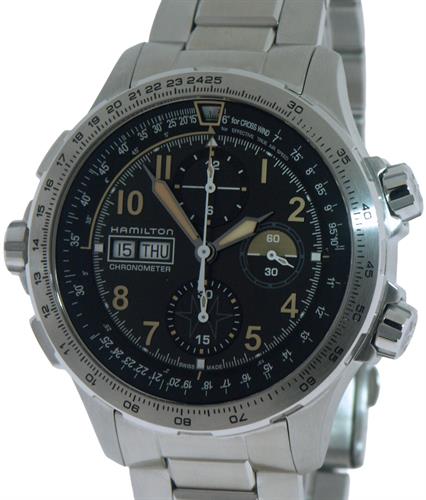 Hamilton Khaki X-Wind model H77796535. Limited Edition of 1918 pieces Worldwide. Hamilton Caliber H-21 SI automatic movement with silicone hairspring and COSC chronometer certification. Packed with functions including chronograph, day/date window, and Hamilton`s ground-breaking drift angle calculator. Stainless steel case. Comes with a stainless steel bracelet and a tan genuine leather strap. Black dial with khaki colored luminous hands and markers.
