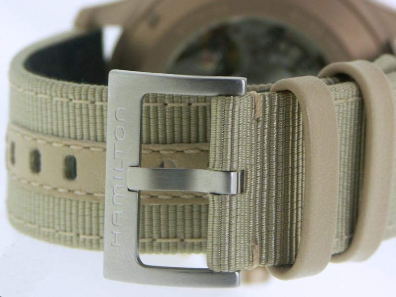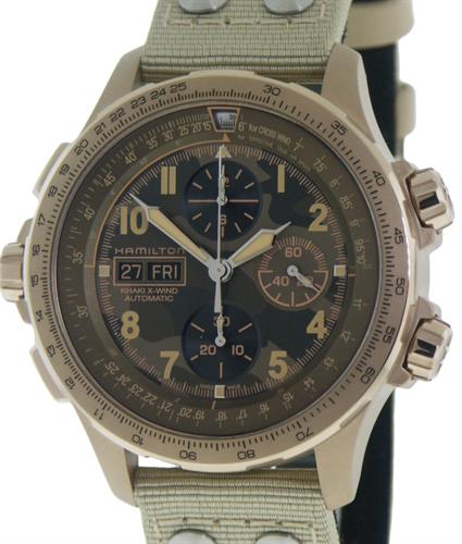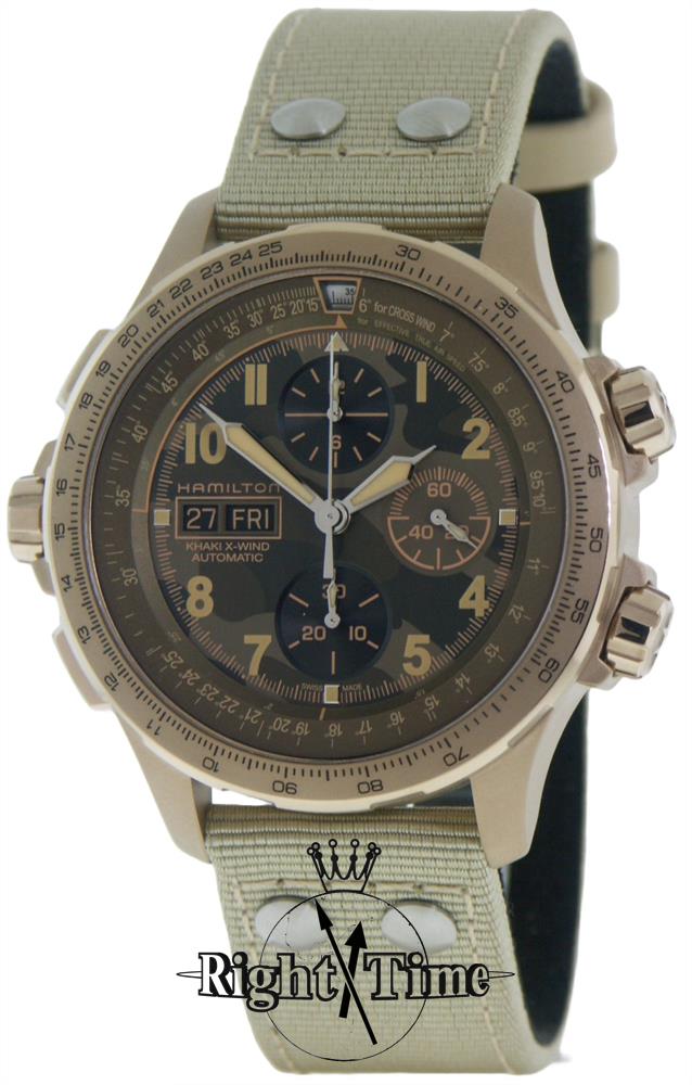 Hamilton Khaki X-Wind model H77916920. Modified Valjoux 7750 Hamilton H-21 SI automatic movement with silicone hairspring. Multitude of functions include a chronograph, day/date window, and Hamilton`s ground-breaking drift angle calculator. Camo-style dial with Arabic numerals. Stainless steel case with beige color PVD coating. Tan textile pilot style strap.