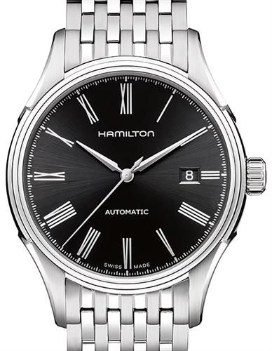 Hamilton American Classic Valiant model H39515134. Swiss made Hamilton H-10 automatic movement with a power reserve of 80 hours. Solid stainless steel case and bracelet. Black dial with Roman numerals. Sapphire crystal.